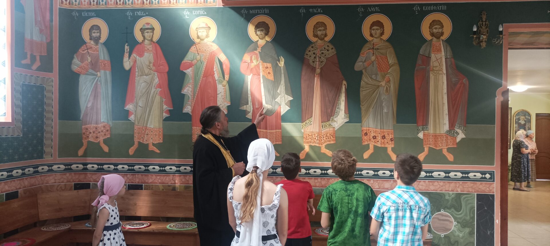 Настоятель храма познакомил ребят с убранством церкви. Рассказал, что в каждом храме есть изображение Христа, святых и обязательно Голгофа — большой деревянный крест с распятым на нём Спасителем.